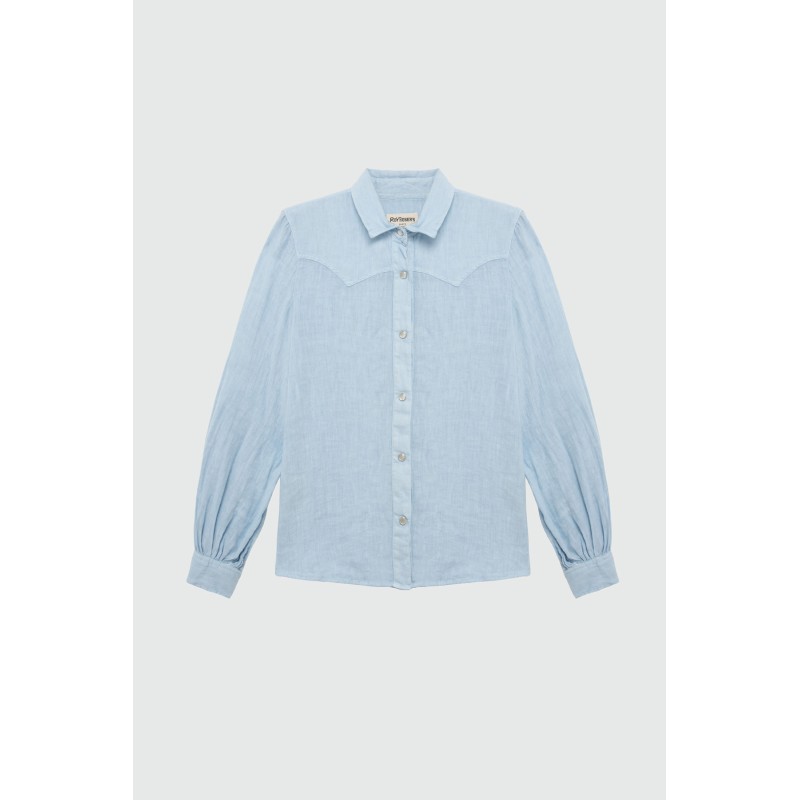 - CAMICIA AURI IN LINO DYED DONNA: si tratta di una camicia in lino con colletto classico e chiusura sul davanti con bottoni a pressione. Le tasche sono piatte sempre con bottone e l’etichetta Roy Roger’s è applicata sul retro. La camicia ha vestibilità regolare ed è realizzata al 100% in lino;